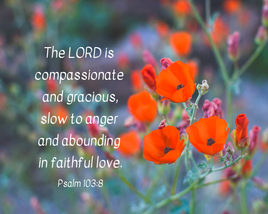 「灵粮经节」:「耶和華有恩惠,有憐憫,不輕易發怒,大有慈愛。耶和華善待萬民;他的慈悲覆庇他一切所造的;The LORD is gracious and compassionate, slow to anger and rich in love. The LORD is good to all; he has compassion on all he has made.」(诗篇 Psalm 145:8-9 节)