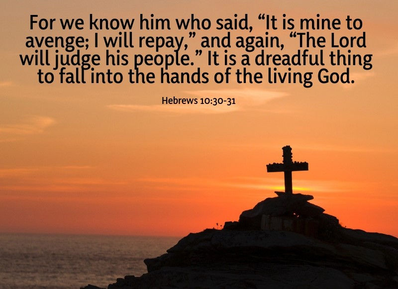 「灵粮经节」:「人干犯摩西的律法,憑兩三個見證人,尚且不得憐恤而死,何況人踐踏神的兒子,將那使他成聖之約的血當作平常,又褻慢施恩的聖靈,你們想,他要受的刑罰該怎樣加重呢!因為我們知道誰說:伸冤在我,我必報應;又說:主要審判他的百姓。落在永生神的手裡,真是可怕的!;Anyone who rejected the law of Moses died without mercy on the testimony of two or three witnesses. How much more severely do you think someone deserves to be punished who has trampled the Son of God underfoot, who has treated as an unholy thing the blood of the covenant that sanctified them, and who has insulted the Spirit of grace? For we know him who said, “It is mine to avenge; I will repay,” and again, “The Lord will judge his people.” It is a dreadful thing to fall into the hands of the living God.」(希伯来书 Hebrews 10: 28-31 节)