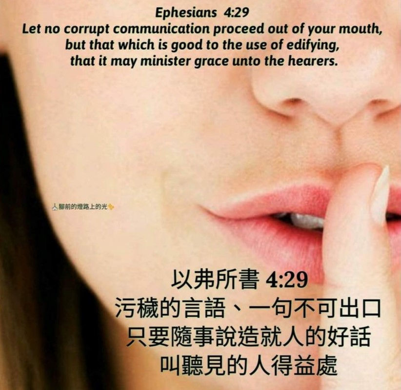 「灵粮经节 TODAY’s Verses」:「使徒保罗在以弗所教会教导我们做基督徒的,对人都要以爱相待,礼义相助;遇见试探,若是生气却不要犯罪;不可含怒到日落,也不可给魔鬼留地步。因此保罗说: “污秽的言语一句不可出口,只要随事说造就人的好话,叫听见的人得益处. “;The apostle Paul taught us in the Church of Ephesus that as Christians, we must treat each other with love and help each other with righteousness; when faced with temptation, if you are angry, do not sin; do not let the sun set on your anger, and do not give room to the devil. Therefore, he says: “Do not let any unwholesome talk come out of your mouths, but only what is helpful for building others up according to their needs, that it may benefit those who listen.” 」 (以弗所书 Ephesians 4: 29 节)